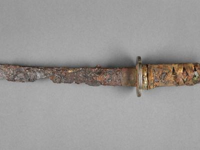 修复后的Wakizashi剑。请注意织物包装和下面的铜装饰元素。(图片来源:©柏林...