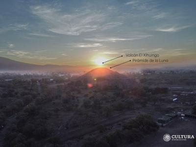 夏至,月亮金字塔和远处的ElXihuingo火山。(图片来源:拉斐尔·莫拉莱斯·奥罗斯科...