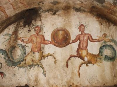 墓中有一幅画,画的是两个鱼半人马,或海洋半人马,在两个丘比特般的婴儿旁边拿着一...