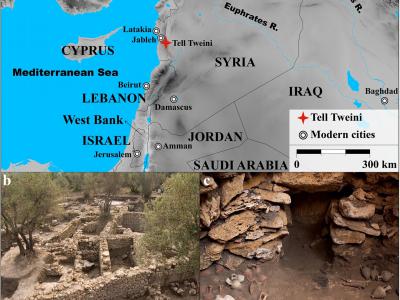 Tell Tweini的地图和照片。(a) 显示Tell Tweini在现代叙利亚的位置的东地中海地图...