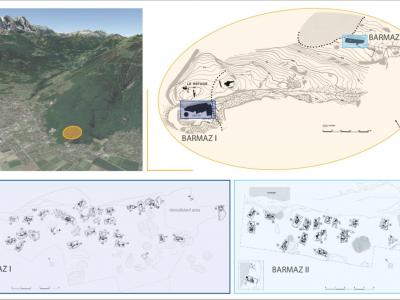 橙色,Barmaz遗址的位置,向南看。它位于海拔2500米的Chablais地块脚下的平原上。该...
