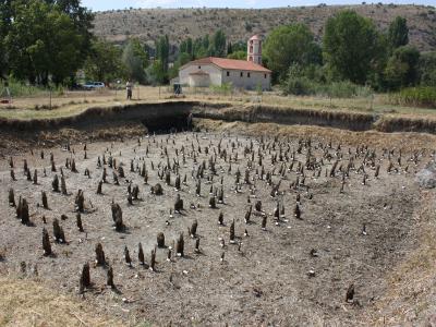 Dispilio现场的桩场。对近800根木桩进行了取样和树木年代测定,这些木桩大多由杜松...