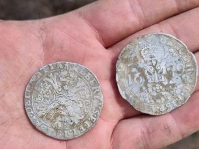 金属探测器在波兰山区发现的众多银币中的两枚。(图片来源:西维托克日斯卡勘探集团...