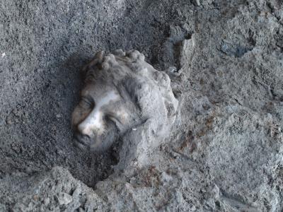 考古遗址令人难忘的景象。一尊神狄奥尼索斯雕像的脸,它是从数千年堆积的沉积物中艰...