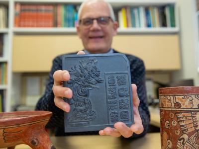 加州大学教授大卫·伦茨(David Lentz)举起了一座雕塑,上面有古代玛雅文字的复制...