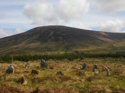 位于Boleycarrigeen的青铜时代晚期石圈,背景是山顶附近的Keadeen cursus。来源:J...