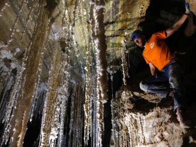 洞内布满盐钟乳石。奈格夫(中)与众人完成了探险任务。盐水从...