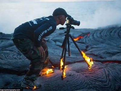 疯狂摄影师走上夏威夷火山的熔岩流拍摄