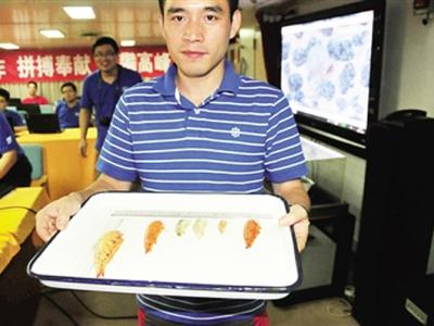 生物学家刘诚刚展示“蛟龙”号生物诱捕装置捕获的端足类生物。 据科技日报:当地...