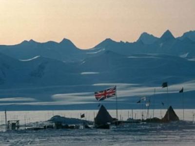 英国国旗在埃尔斯沃思湖的野外营地上空飘扬,照片背景是南极洲最高的山脉埃尔斯沃...