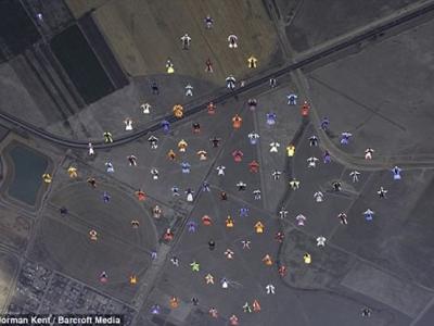 动员们在空中组成菱形阵型 100名跳伞运动员欲创造第一个3900多米高空造型跳伞...