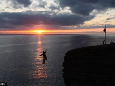 法国冒险家到苏格兰的崖壁上走钢丝并极限