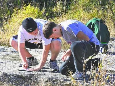 学生们正在Coralville湖旁的岩石中寻找化石 自然科学老师P.Witinok带着当地一群...