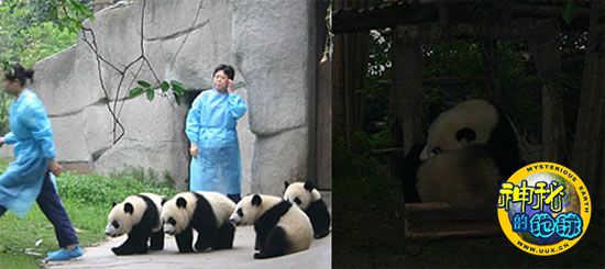 8点30分左右,6只9个月大熊猫,欢快地跑出兽舍,与往常一样在幼稚园内欢快地玩耍(左图)。9时11分,天空变得全黑,大熊猫开始变得烦躁(右图)。 霍潺 摄(来源:中国新闻网)