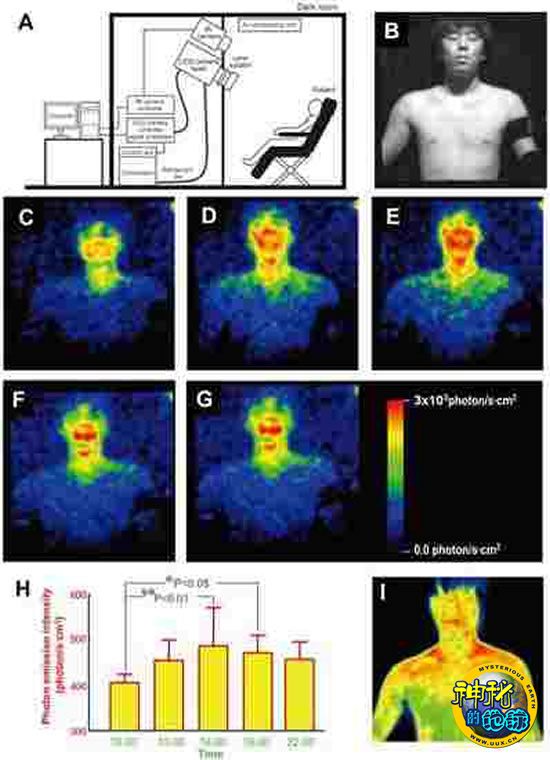 为了进一步了解这种微弱的可见光,日本科学家使用了能检测到单光子的超敏摄像机。5名20多岁的健康男性被安排连续3天,每天从上午10点到晚上10点,每隔3小时上身赤裸站在摄像机前20分钟,房间不透光,一片漆黑。研究人员发现,身体发光强度在一天内起起伏伏,发光最弱的时候是上午10点,发光最强的时候是下午4点,之后逐渐变弱。这些发现显示,发光和我们的生物钟有关,最可能与我们的代谢节律在一天中的波动状况有关。