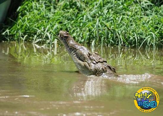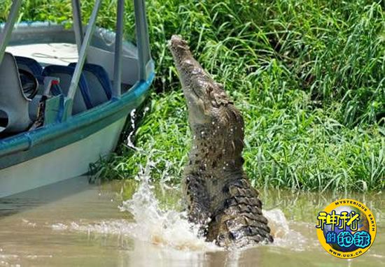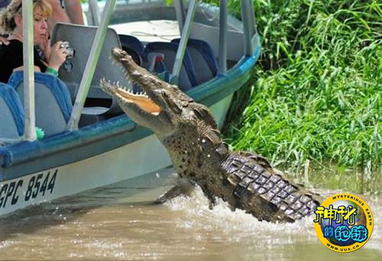 导游拿木棍敲打船舷,结果鳄鱼跃出水面