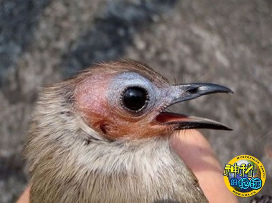野生动物保护协会7月29日发布了“秃头”夜莺的照片。照片显示,这种鸟头上除两眼之间有一道窄窄的软毛外,其他地方都是光秃秃的,其脸部皮肤为粉红色,眼圈呈蓝色,鸟的大小与画眉差不多。