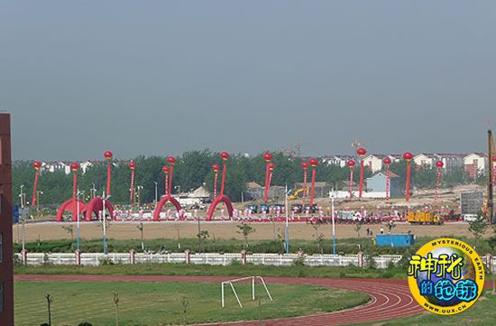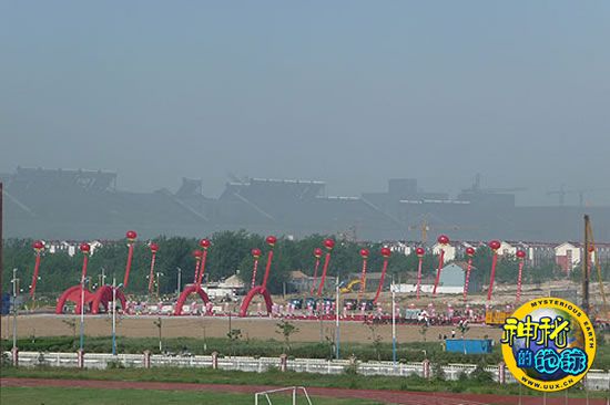 从画面大家上可以看到,悬挂着红色拱门和气球,正待施工的场地上空,一撞撞高大建筑清晰可见,建筑物顶部一个个排列整齐的太阳能热水器仿佛就在眼前。从形状上看,空中出现的景物酷似一个居民小区,大约3分钟左右,工地上方出现的景象逐渐消失。