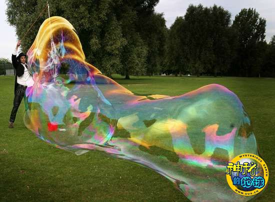 据英国《每日邮报》报道,英国一名37岁男子萨姆萨姆被誉为“肥皂泡人”,日前吹出了一个长20英尺(约6米),直径约5英尺(约1.5米)的大肥皂泡,这是迄今世界上最大的肥皂泡,有望打破吉尼斯世界纪录。