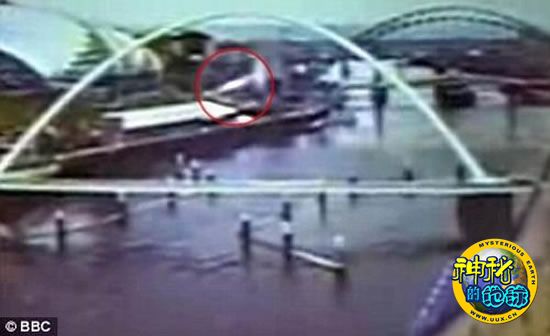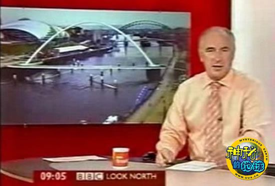 8月6日,节目主持人科林-布瑞格斯(Colin Briggs)在播报早间新闻时,大屏幕上纽卡斯尔市中心泰恩河的实时摄像机显示一个不明飞行物体迅速飞向天空。这个UFO飞行物出现在屏幕的左下侧,启动飞行穿过纽卡斯尔千禧年桥的拱形结构,最后消失在屏幕的右上方。
