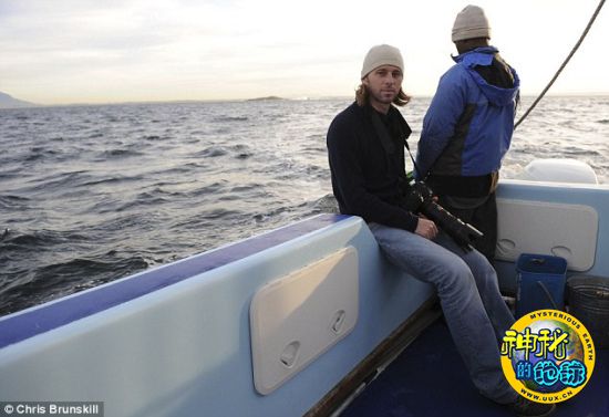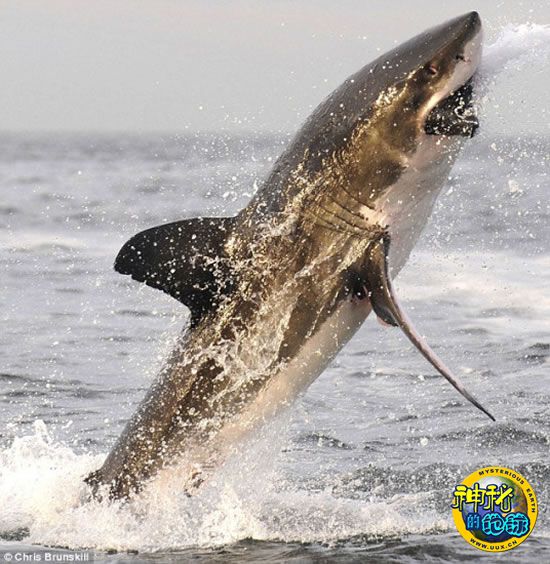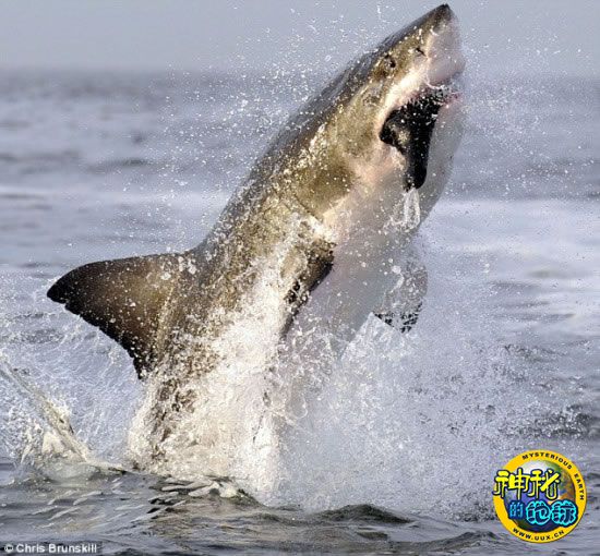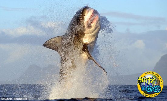 这张鲨鱼跃出水面的照片是野生动物摄影师克里斯·布鲁斯基尔抓拍到的。当时他和同伴在南非开普敦附近海豹岛上网住一只海豹诱饵,等候3个小时,等待鲨鱼嗅到并追随小船。突然,这只鲨鱼破水而出,以迅雷不及掩耳之势一口咬住猎物。福尔斯湾海豹岛周围的这一区域是世界上唯一鲨鱼经常跃出水面的地方,因为在这里大量海豹靠近海面游动。