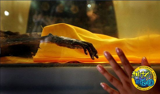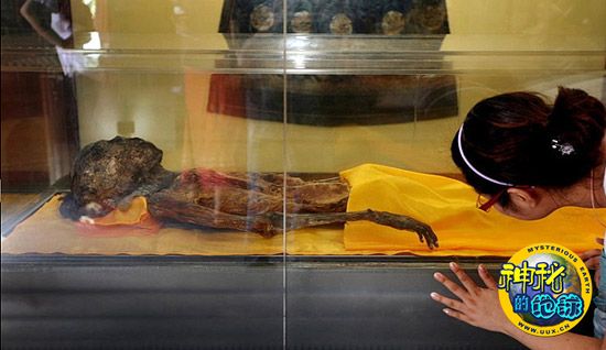 陈列馆的工作人员介绍,干尸在展出前先用酒精消毒,并保存在一个真空玻璃棺内。室内保持恒定的16摄氏度,可以长期保存干尸。