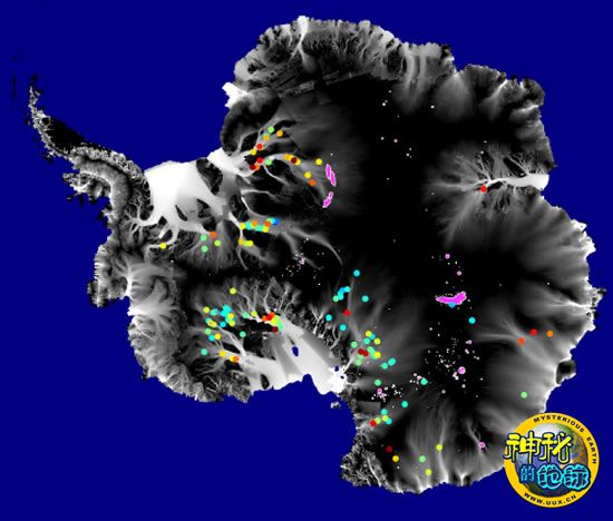 图片上的点代表科学家确认的南极大冰原下方124个“活湖”的方位。使用暖色点(橙色和红色)标注的湖泊水量较多,冷色点(绿色和蓝色)标注的湖泊则水量较少。紫色区域代表此前已知的不活跃湖泊方位。