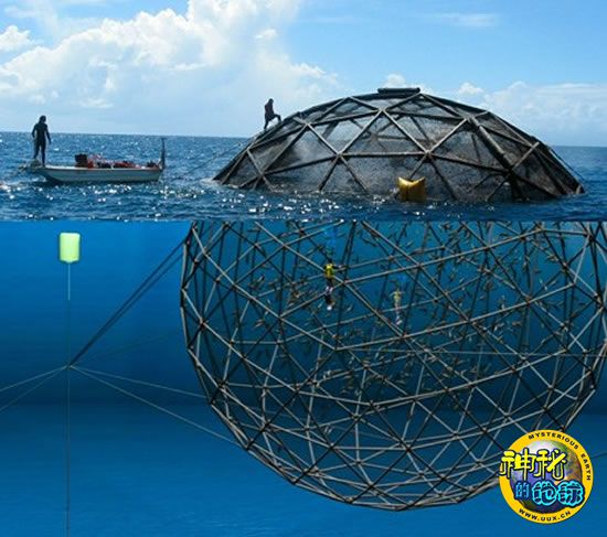 这张未标注日期的合成图片展示了漂浮在波多黎各Snapperfarm渔业公司养鱼场的新型养鱼笼,名为“水中豆荚”。“水中豆荚”由三角形嵌板构成,嵌板上方覆盖着带有乙烯基涂层的镀锌钢网,这种养鱼笼的直径在8至28米左右。