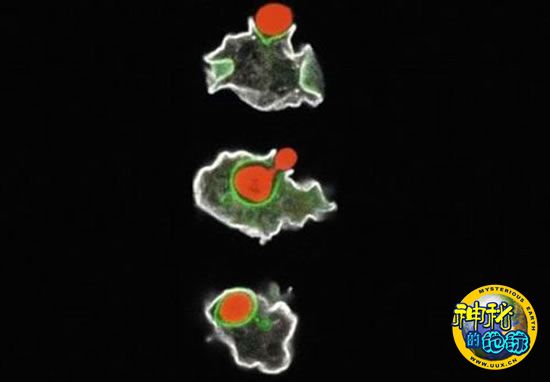 如图所示,图片中白色部分是黏液菌,它被一个酵母细胞(图片中红色部分)所吞没,绿色部分是液泡。