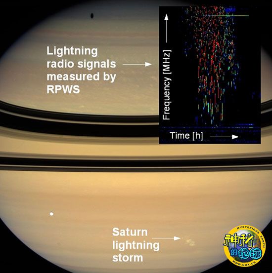 当前发生的雷暴是“卡西尼”号自2004年7月进入土星轨道后观测到的第9次雷暴。土星大气层中的闪电放电放射出能量巨大的无线电波,“卡西尼”号所携无线电波与等离子体波科学仪器(以下简称RPWS)的天线以及接收器能够对这种无线电波进行测量。大气层中无线电波的强度大约是陆上无线电波的1万倍,它们来源于土星大气层内发生的巨大雷暴,直径在1900英里(约合3000公里)左右。