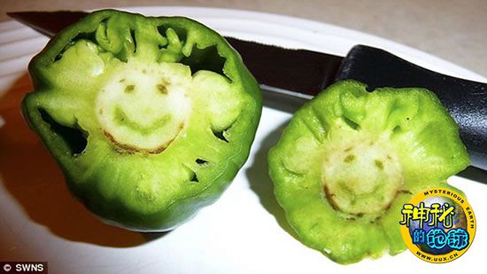 另外,一周前,一个园丁在切开一个墨西哥胡椒的时候,竟然发现胡椒的横切面惊现“笑脸”,甚至还有眼珠。近几年来,奇形怪状的蔬菜水果开始登上各大媒体的头版头条:婴儿形状的梨、酷似女巫的欧洲防风草以及长得非常像泰迪熊的西红柿。