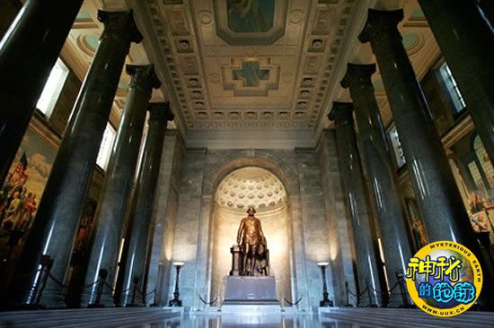 在位于华盛顿特区市郊、弗吉尼亚州东北部城市亚历山德里亚的乔治·华盛顿共济会国家纪念馆(George Washington Masonic National Memorial),矗立着一尊美国开国元勋乔治·华盛顿的铜像。华盛顿也是一位共济会会员。在纪念馆外面,作为共济会的重要象征,一座小型金字塔让这座建于20世纪30年代的纪念馆相形见绌,里面放着华盛顿在共济会生活的文物,在一个白色窗纱后面是约柜的“复制品”,是根据《圣经》中的描述打造的。