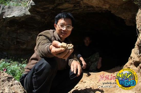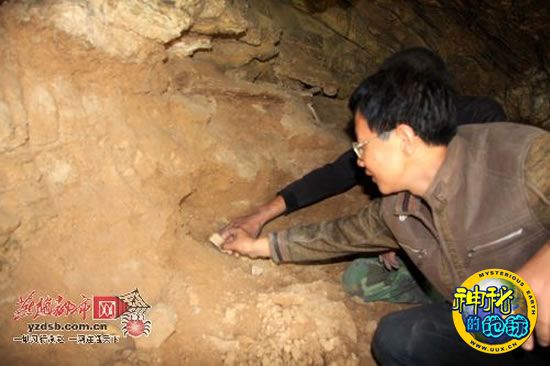 焦先生说,9月17日,他在附近考察时看到了这个洞,根据他对该处地层地质年代的初步判断,感觉此处应该有化石遗迹。于是他从老乡家借了一把铁锹,在洞内试着挖了两锹,没想到竟然挖出了几块大小不一的生物化石,在泥土中,一些形状奇特的石锤、石斧也露了出来。因担心破坏洞穴内的遗存,焦先生没有继续往下挖。