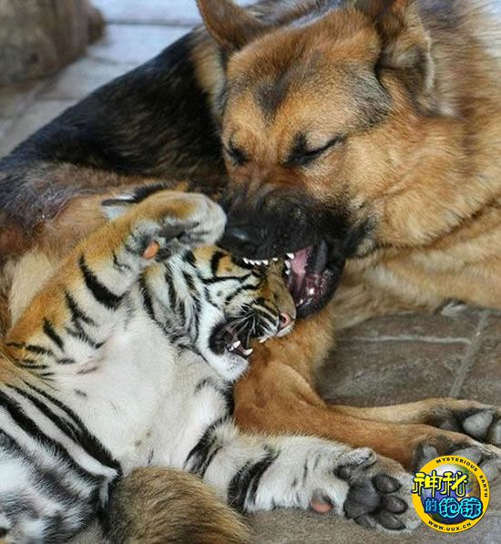 小老虎淘气的话,德国牧羊犬要教训一下。