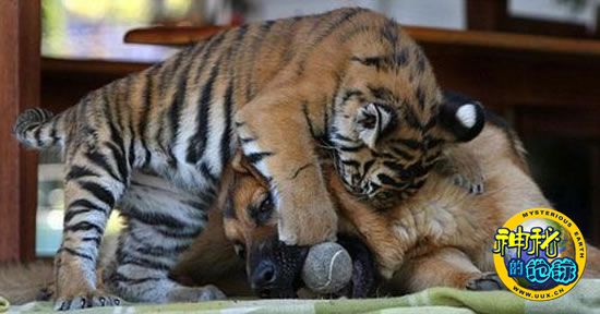两个小家伙很快便熟悉起来,并且非常友好地相处。有时,小老虎太淘气,牧羊犬大哥便会轻轻地“咬”一下以示警告。金瓦困的时候会蜷缩在“兄长”的身边睡觉,而茹姆勃也会很乐意地让金瓦靠在自己身边。