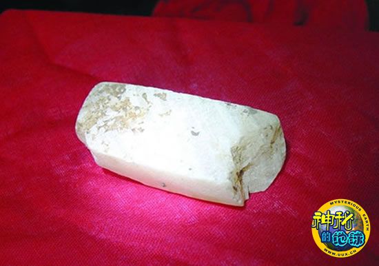 这块古玉为白色石英石质,质地纯净,呈半透明状,长65毫米,宽27毫米,高16毫米,各面经过磨制,比较规整,名称和用途不详。更为珍贵的是,这块玉石上还残留有一些黄、褐色的附着物,疑为入土时有机物残留。这块玉石出土的位置位于磁山遗址1号窖穴的底部,经中科院、农科院采样队员认定,属磁山文化一期地层。