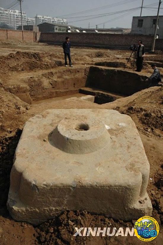 在西安木塔寺遗址新发现的一件重达5吨的巨石舍利塔基座(9月23日摄)。新华社记者 冯国 摄