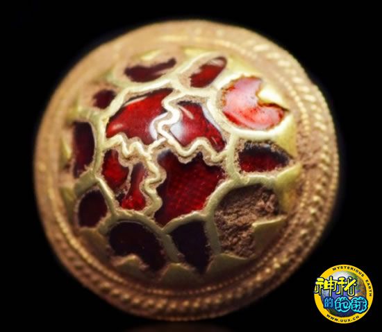 一个镶嵌着石榴石的金剑配件,此时的它刚从地里挖出来