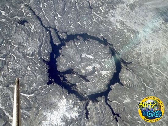 加拿大曼尼古根陨石坑位于加拿大北部,又名“魁北克之眼”,是地球上已知最大的陨坑之一。大约在2.1亿年前三叠纪晚期,一颗直径3英里(5公里)的小行星撞上地球,产生一个直径62英里(100公里)的大洞。如今在该陨坑边缘处有一个绵延70公里的水电站水库。陨坑中央有一座因小行星撞击导致地面抬升所形成的小岛。该照片是美国航天飞机航天员所拍摄的,左下角处显示的是航天飞机的尾翼。