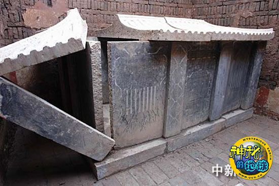 墓室西半部分是一座完整的石椁,石椁南侧的顶部已被盗墓贼掀开,石椁内的骸骨集中在椁内北侧。石椁顶呈四面坡形,面阔三间,进深两间,共由四块盖板、十块帮板、四块底板、十块立柱构成,底座长约两点九米,宽一点八米。石椁上有精美线刻,东壁中部开间线刻假门,门上有泡钉,周围线刻花卉和蔓草,两侧开间中部线刻直棂窗,周围线刻花草,两边缘立柱上线刻头戴襆头、拱手而立的男侍,南侧帮板外侧及石椁内侧均线刻体态丰腴的侍女。