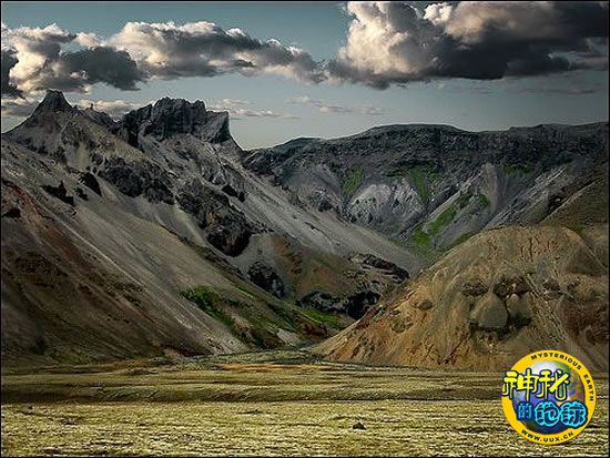 这张照片上有很多嶙峋怪石。在冰岛神话传说中有许多妖怪在大白天变成了石头。这些怪石有些状如尖塔、有些状似古堡,簇拥在一个狭长的山谷周围,山谷旁边的山脊就像一个沉睡的巨人。
