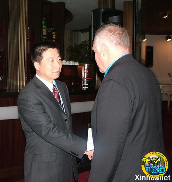 10月5日,在捷克首都布拉格,中国首位航天员杨利伟(左)与世界航天员大会的一名组织者握手。