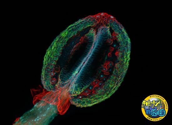 这张发着异光、半透明的照片捕捉到拟南芥花药奇景。2000年,科学家完成了对拟南芥基因组的排序工作。据摄影师、科学家海蒂·帕维斯(Heiti Paves)博士介绍,这张照片没有任何科学意义,之所以拿出来参赛,是因为它恰好是自己数千张照片中最具艺术性的作品。拟南芥还是植物生物学的模式生物。