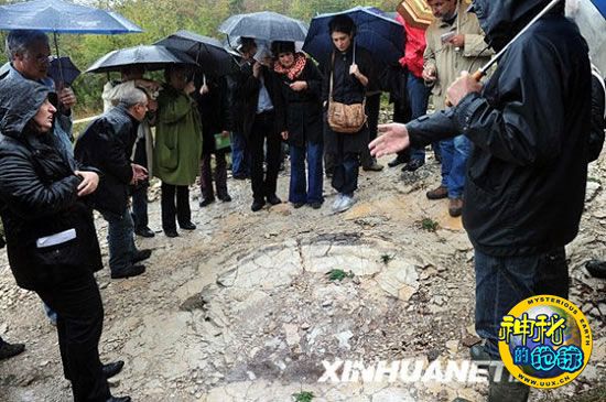 10月8日,在法国东南部城市里昂附近的普拉涅,人们观看“恐龙足迹”。