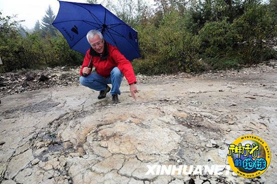 10月8日,在法国东南部城市里昂附近的普拉涅,皮埃尔·昂斯佩尔格教授指示地面上的“恐龙足迹”。