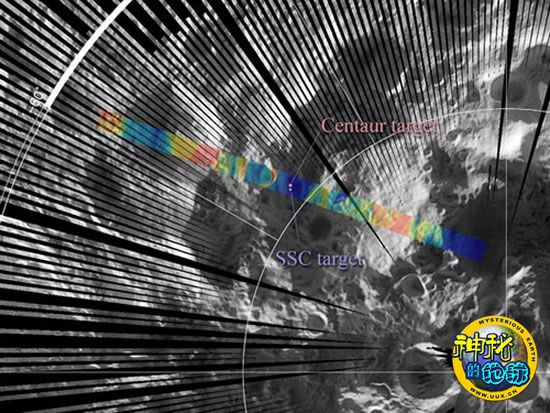 上周拍摄的凯布斯坑温度图显示了LCROSS探测器撞击的热量信号。LCROSS探测器在撞向月球表面前几分钟,也根据“半人马座”火箭级撞击溅起的羽状尘埃物质,对凯布斯坑进行了观测。但是,两次撞击是否产生足够多的月球尘埃物质还有待研究。科学家预测,撞击凯布斯坑可以激起最高6.2英里(约合10公里)的尘埃物质,这样一来,尘埃物质可以被太阳照亮,地面观测就能看得见。