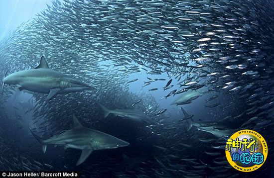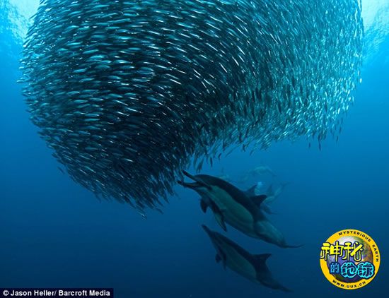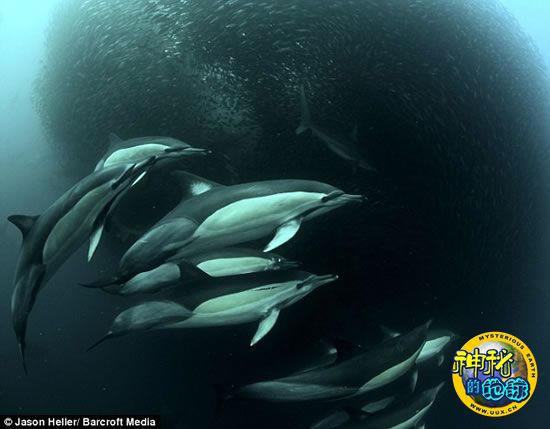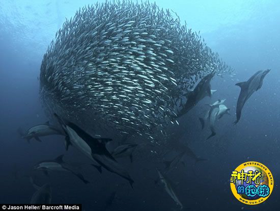 一名水下摄影师日前正巧捕获到了海豚、鲨鱼和海鸥联合围攻最大的沙丁鱼群的罕见场面。