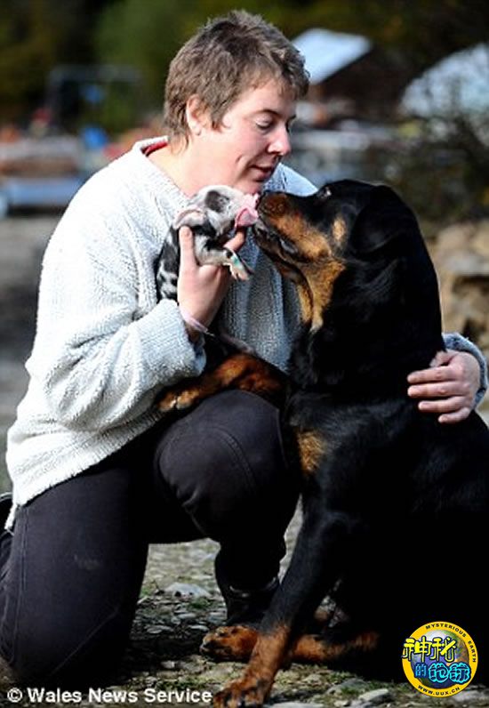 萨沙18个月,重45公斤,这是它第一次产崽,3周大的苹果沙司在2周大的小狗身边安静下来。海蒂说:“在我把它送到萨沙身边时苹果沙司瘦得皮包骨头。现在,它体重增加了,开始变胖了。当时苹果沙司很可怜,萨沙知道这一点,它设法舔它,安慰它。它本能地知道苹果沙司不够健康。我们给苹果沙司开小灶,当我们把它抱走时,萨沙发出忧虑的哀叫声,好像在说:‘你带走我的孩子干吗?’或许萨沙蒸馏了苹果沙司是因为它欣然接受了小猪,把它看做是自己的孩子,这说明任何事都是有可能的。现在,萨沙是你想象中的最好妈妈,它很快喜欢上了这只小猪。小狗和苹果沙司也看起来相处融洽,小狗是纯一色的黑色罗特韦尔犬,小猪是粉色和蓝色相间,看到它们在一起你会感觉很温馨。我们饶有兴趣的观察着事态的进展,但是,无论如何,苹果沙司都会被我们当做宠物,我们不会把它卖掉。”