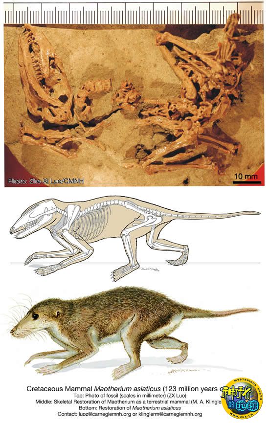 此次研究的化石标本被命名为Maotherium asiaticussp.Nov.(亚洲毛兽),化石保存得非常完整,是2005年省地质博物馆在标本采集征集工作中征集到的、成为河南省地质博物馆重要的馆藏标本。该哺乳动物的牙齿具有对称排列的齿尖(被称为对称齿兽),主要以昆虫和蠕虫为食,是一种陆生哺乳动物,体长约15厘米,体重约70~80克。最重要的科学意义在于该哺乳动物的耳区,根据研究,毛兽的中耳骨骼在一定程度上与现生的哺乳动物相似,但与现生成年哺乳动物不同,其中耳与下颌形成了特殊连接。这种连接也称为骨化的麦氏软骨,与现生哺乳动物胚胎发育的情况,以及与前哺乳动物祖先的原始中耳相似。新化石为哺乳动物耳区结构的演化研究提供了珍贵的信息。