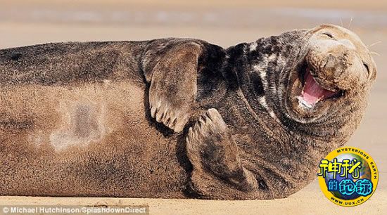 据英国《每日邮报》报道,自然摄影师迈克尔·汉钦森(Michael Hutchinson)最近在英国林肯郡劳斯附近的一处海滩上拍到了一幅有趣的画面,海岸边一只巨大的灰色雄性海豹露出一副“咧嘴大笑”的神情。
